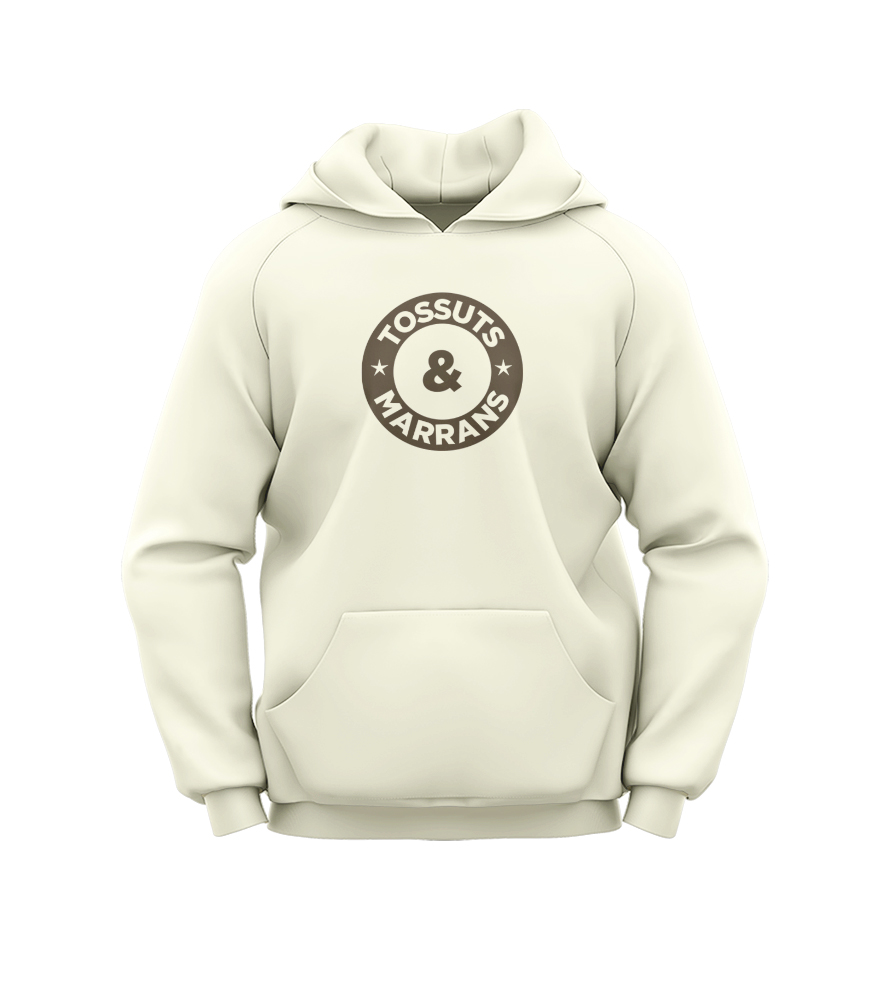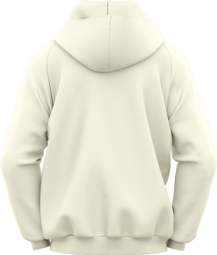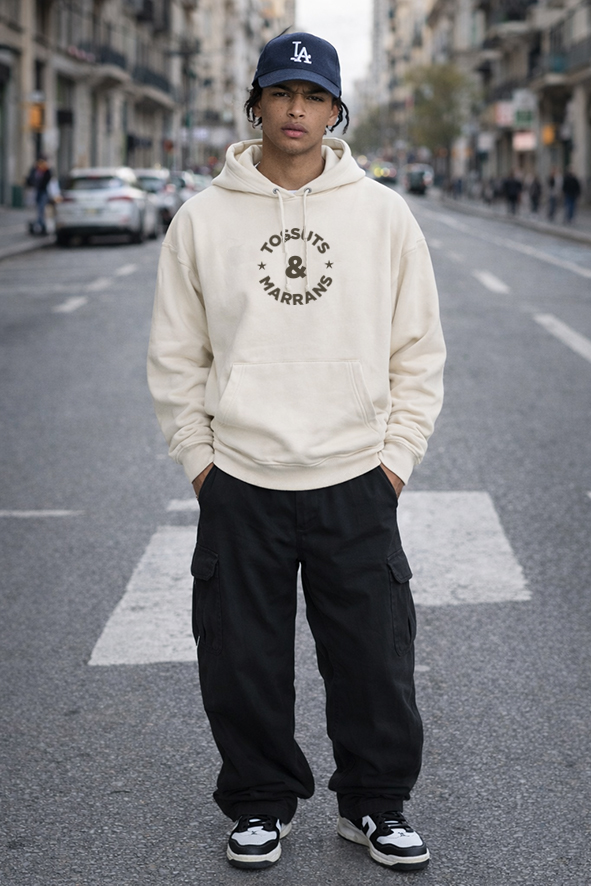 Dessuadora ecorresponsable de color ivory, unisex, fabricada amb cotó orgànic més ecològic i étic amb tacte suau de 350 gr/m2., pentinat Tingspun de Felpa Perchada, amb caputxa i butxaca tipus cangur amb cordó rodó amb puntes i traus de metall reciclat, marcada amb DTF. (Imatges no contractuals)